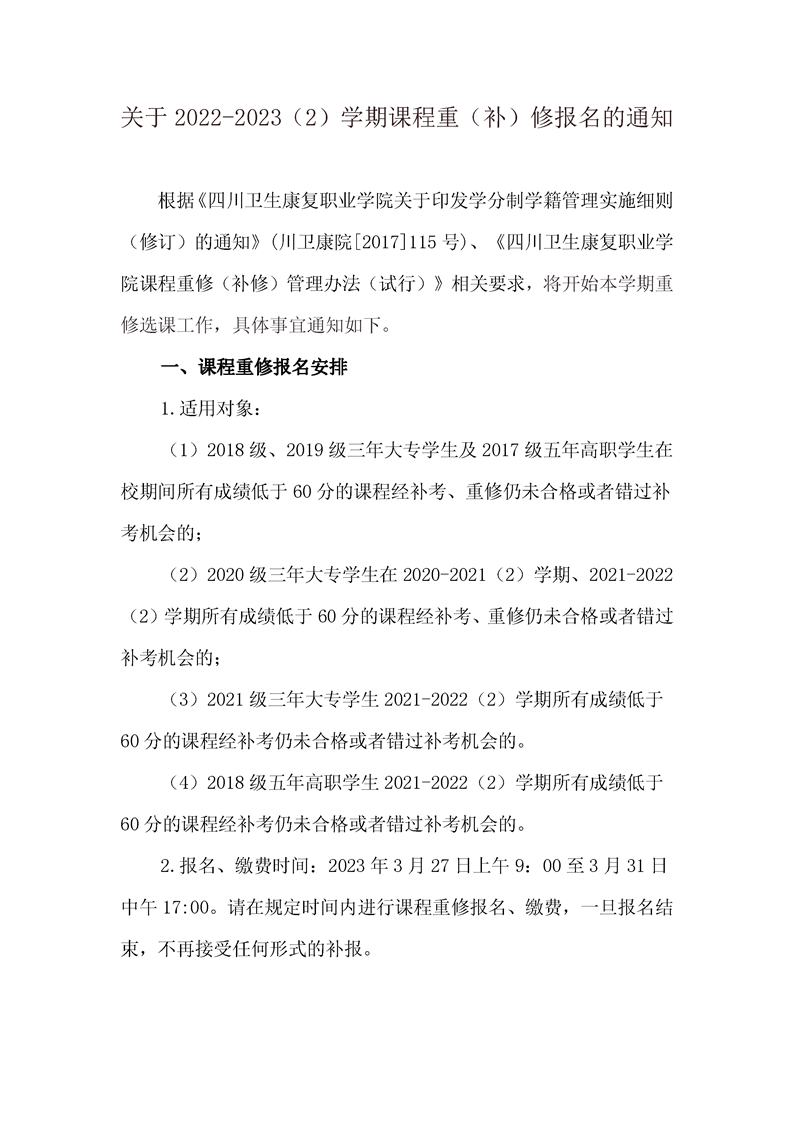 关于2022-2023(2)学期课程重(补)修报名的通知