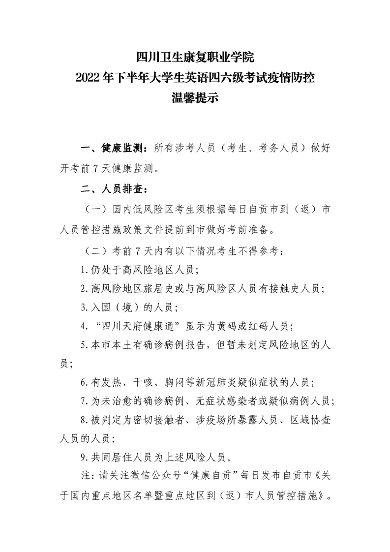 2022年下半年大学生英语四六级考试疫情防控温馨提示