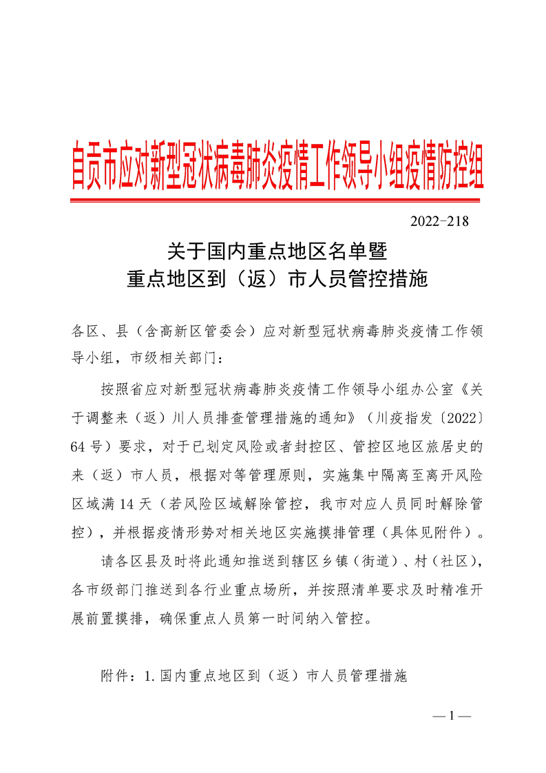 关于国内重点地区名单暨 重点地区到(返)市人员管控措施