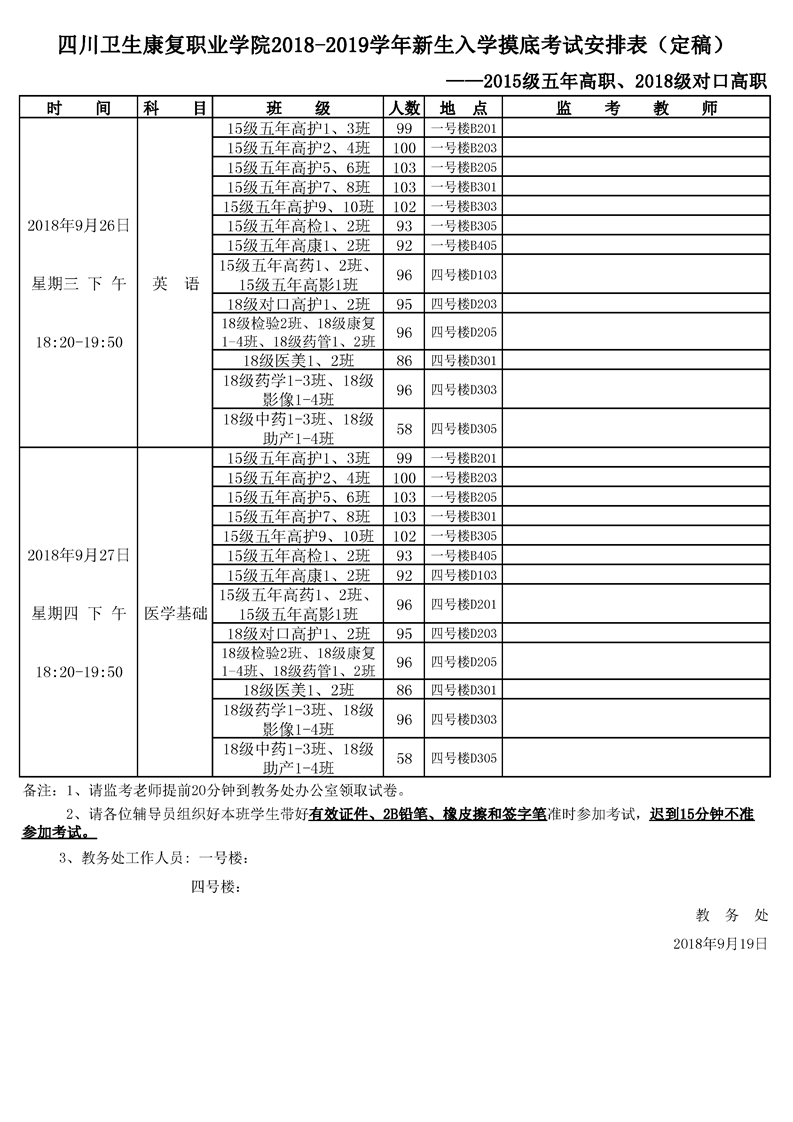 bat365官方网站2018-2019学年新生入学摸底考试安排表