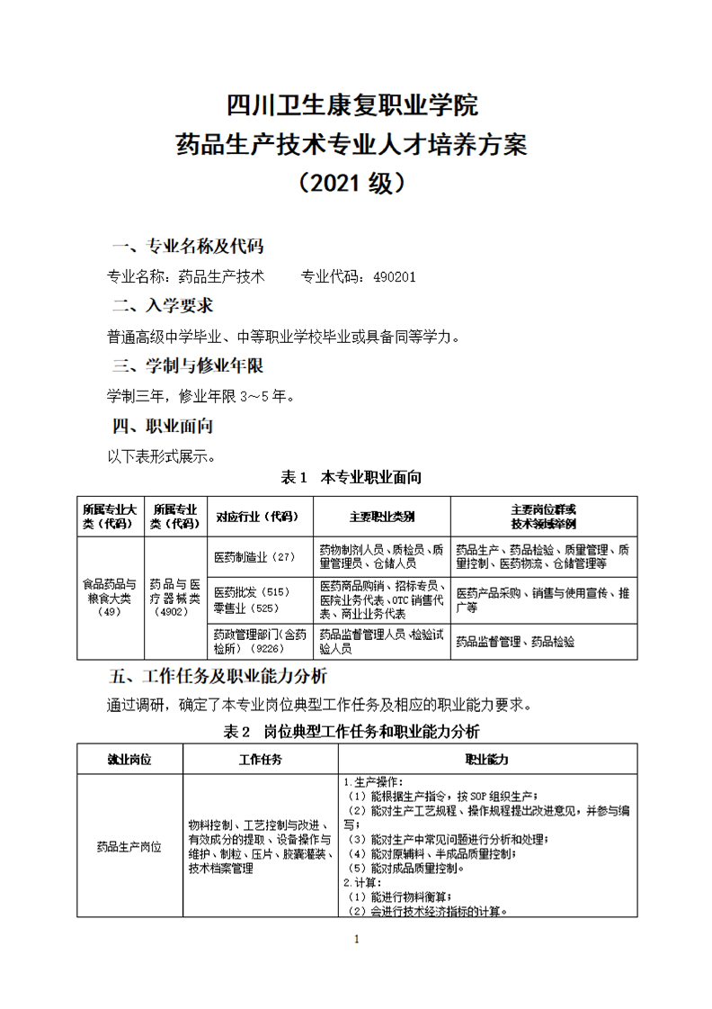 bat365官方网站药品生产技术专业人才培养方案(2021级)