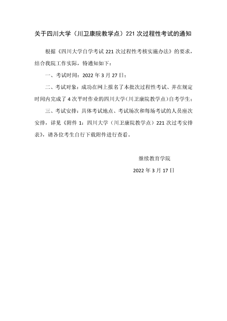 关于四川大学(川卫康院教学点)221次过程性考试的通知