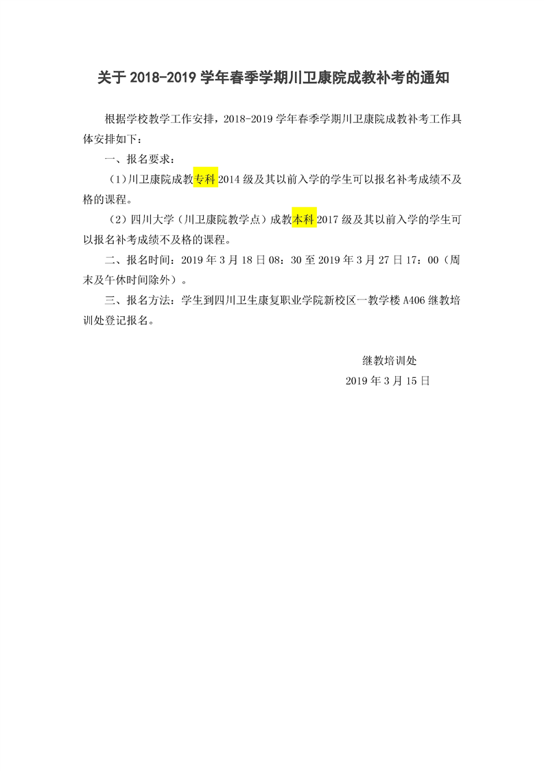 关于2018-2019年春季学期成教补考的通知