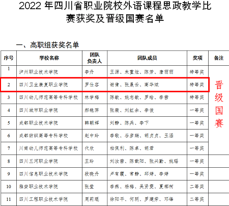11月29日,2022 年四川省职业院校外语课程思政教学比赛省级获奖名单公布,教育体育学院英语教师罗仕容带领参赛团队(罗仕容、谢倩、张晨云、高华斌)经初赛、复赛激烈角逐,从全省101个参赛团队中脱颖而出,斩获四川省高职组“特等奖”,并赢得“优秀组织奖”,同时顺利入围全国总决赛。