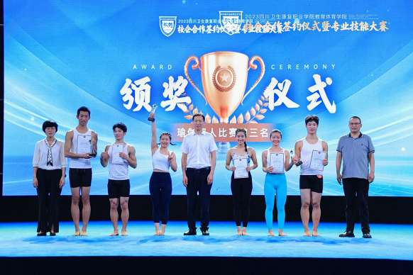 在紧张激烈的角逐后,主持人宣布比赛成绩,学校领导和企业代表上台为获奖选手颁奖,合影留念。至此,教育体育学院2023年校企合作签约仪式暨专业技能大赛圆满落幕。
