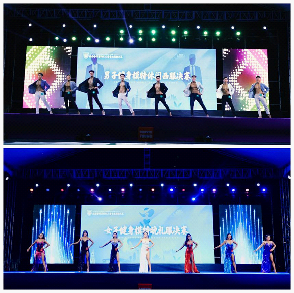 进入比赛环节,此次赛事设置瑜伽单人组、瑜伽双人组、男子古典健美组、女子健身模特运动装组、男子健身模特休闲西服组、女子健身模特晚礼服组六个组别,共计50余名运动员依次上台展示。整场比赛精彩纷呈、亮点频出、气氛热烈,教体学子的出色发挥和精彩表现,为我们带来了一场青春活力、动感十足的视觉盛宴。