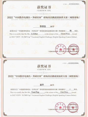 近日,在刚刚结束的2022年“中国教育电视台·外研社杯”职场英语挑战赛演讲大赛网络赛场中,21级临床学生袁平(指导教师:李捷)、21级教育体育学院学生李泽浩(指导教师:洪晓静)与来自全国28个省、市、自治区几百位选手同台竞技,通过初赛、复赛、决赛三个阶段的比拼,最终袁平获得比赛一等奖,李泽浩作为四川唯一一名特等奖选手晋级全国总决赛。