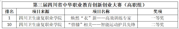 近日,由省委统战部和自贡市委指导,自贡市人民政府支持,省中华职业教育社、省教育厅、省人力资源社会保障厅、省总工会、省科协、省工商联联合主办,自贡市委统战部、bat365官方网站承办的第三届四川省中华职业教育创新创业大赛决赛在bat365官方网站举行。bat365“焕然‘衣’新--高效训练专家”“‘惜膝’相关--智能运动护具先锋”2个项目,分获高职组一等奖、二等奖,学校荣获最佳组织奖、最佳人气奖。