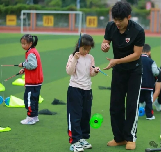 活动现场,bat365师生充分发挥专业优势,通过“理论讲解+实操演示”相结合的方式,向孩子们系统介绍了空竹的历史沿革、文化内涵与健身价值。教学环节中,团队成员耐心细致、手把手指导孩子们学习空竹的基本操控技巧,分解每一个动作要领,确保大家听得懂、学得会、做得对。在专业引导下,孩子们迅速掌握了基础动作,操场上空竹嗡鸣、笑声阵阵,传统体育的活力与趣味在校园中生动绽放。