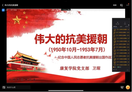 抗美援朝战争,既是从中国的安全出发,又是从拯救朝鲜于危难之际的需要考虑,也是着眼于维护亚洲和世界和平,体现了高度的国际主义精神。我们要传承和发扬抗美援朝精神,雄赳赳、气昂昂,向着实现中华民族伟大复兴的中国梦奋勇前进。2022年11月4日党建促进会举办了以“光影镌刻历史,回溯抗美援朝”为主题的线上精品党课活动。康复学院支部委员卫琛为大家授课。