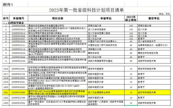 四川省科技厅公布了2023年第一批科技计划项目公示名单,bat365康复学院宋凯的申报课题《基于PTEN/AKT/FoxO3a信号通路探讨电针对PTSD恐惧消退障碍大鼠杏仁核小胶质细胞炎症与自噬损伤的影响》获批立项(Excel序号1821),资助经费10万元。