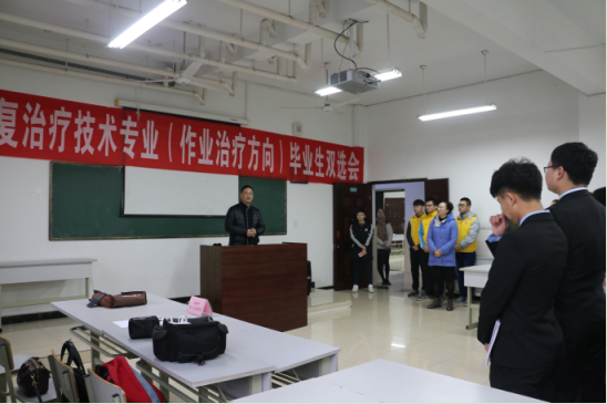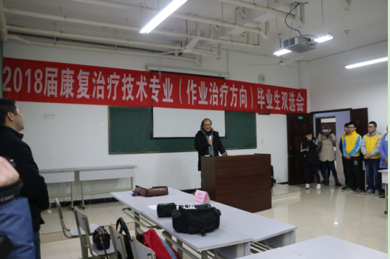 2018年1月6日,在bat365实训楼502召开了2018届康复治疗技术专业(作业治疗方向)毕业生双选会,本次双选会由康复系主办。香港职业治疗学院副院长梁国辉教授、康复系主任章荣,12家用人单位(成都顾连锦宸康复医院、成都第二人民医院,绵阳科学城医院、德林义肢康复器材(成都)公司等)以及到校准备充分、蓄势待发的毕业生们,一起开始了一场别开生面的考量。