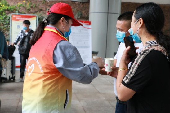 志愿者为一路奔波的家长们送上一杯热水