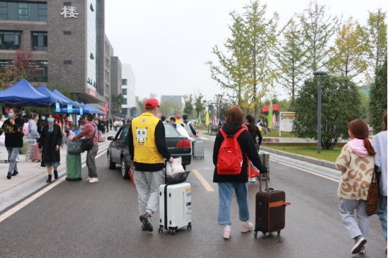 志愿者迎接下车的新生们