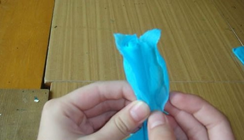 第五步:将花瓣分开,先用刚刚剪花瓣剩下的皱纹纸做出花蕊,包好花瓣即可。