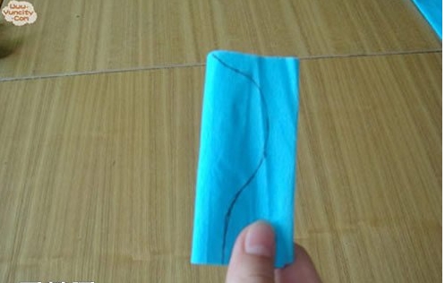 第三步:把皱纹纸对折,然后靠近折痕画出半个花瓣的形状。
