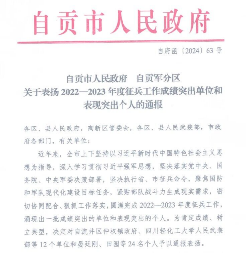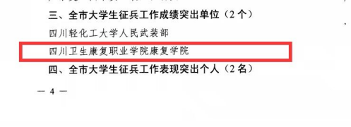 近日,自贡市人民政府、自贡军分区发布《关于表扬2022—2023年度征兵工作成绩突出单位和表现突出个人的通报》,康复学院获评“全市大学生征兵工作成绩突出单位”。