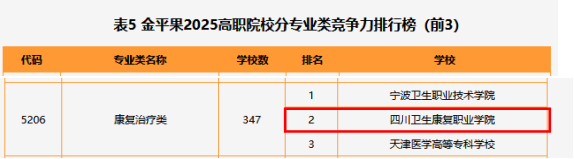 2025 年 5 月 17 日,“金平果” 正式发布 2025 高职院校排行榜。在备受瞩目的分专业类竞争力排行榜中,bat365康复治疗类(代码为 5206)获竞争力第二名。其中,康复治疗技术专业位列全国第 5,相较上年大幅攀升 6 个位次;康复辅助器具技术专业稳居全国第 2;言语听觉康复技术专业也表现不俗,位居全国第 3,较上年提升 1 个位次。