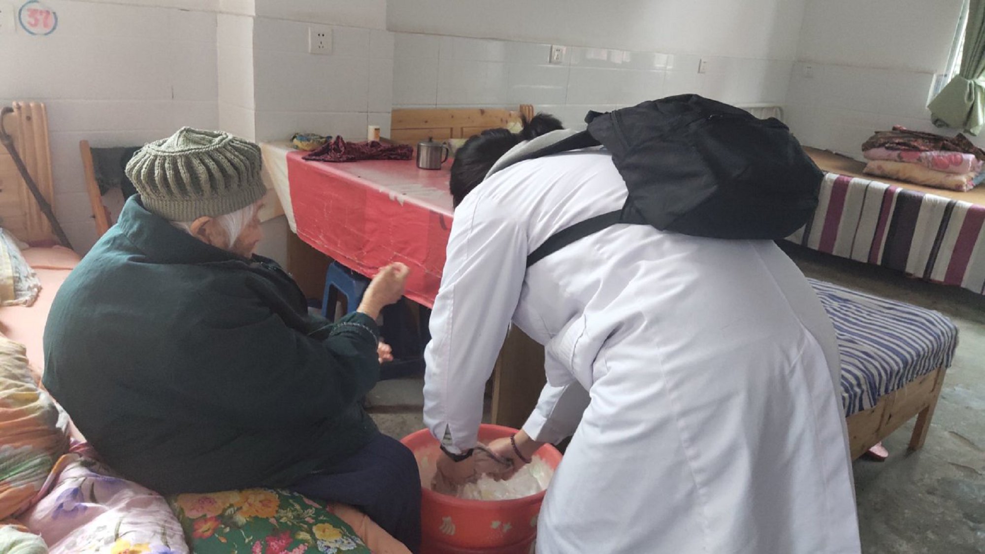 在与老年公寓的管理人员进行简单的交流过后,大家分成两组,分别前往不同的楼栋为公寓内的老人们进行康复服务。