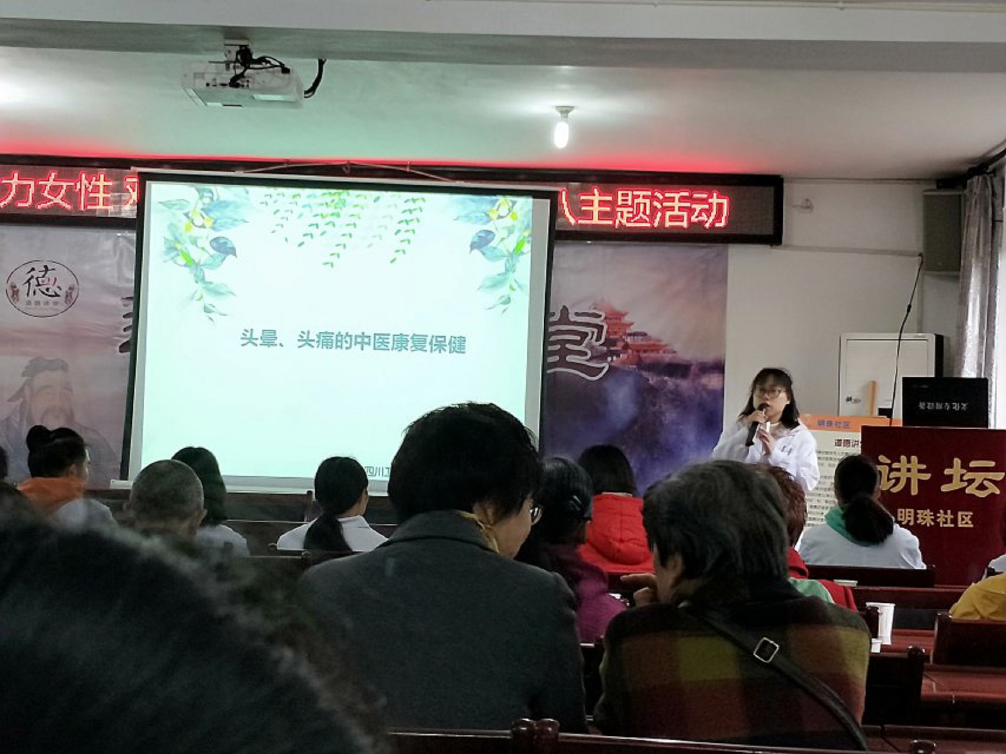 在前期调查了解中,我们发现该社区居民经常出现头晕头痛等问题,于是田璐老师精心准备了《头晕头痛的中医康复保健》知识讲座。通过宣讲,居民们初步掌握缓解头晕头痛和掌握日常保健的相关知识。