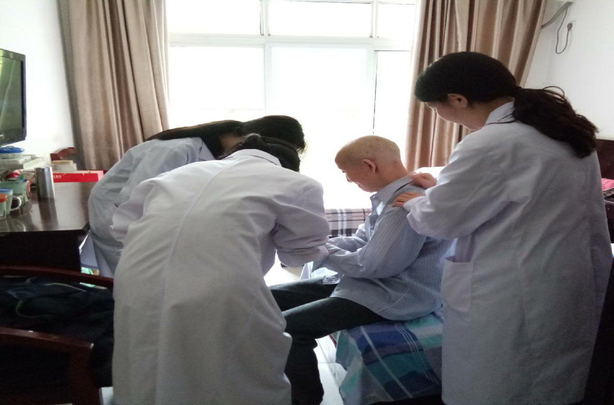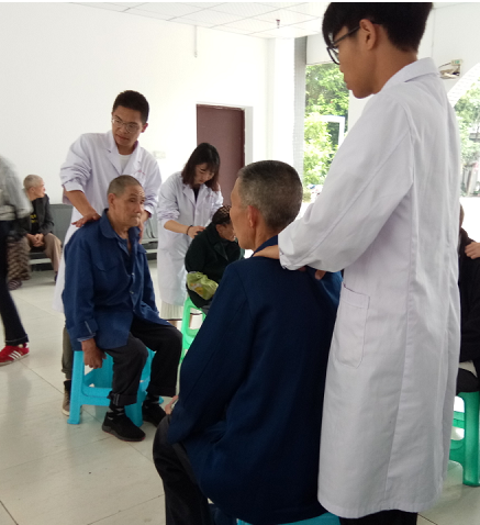 到达之后福利院负责人向大家简单介绍了福利院的一些基本情况。在那里有可以自己活动、自理的老人,也有一些常年因为疾病不得不卧床休养的老人。于是同学们分成两组,一组同学进入房间为卧床老人进行传统手法按摩,另一组同学则在赵老师的带领下在空旷的地方为老人们进推拿、艾灸、中频等治疗。在服务过程中,同学们耐心、热情的为每位老人解答他们提出的疑惑,也向他们讲解了一些疾病预防的相关知识,并告诉老人们日常生活中一些能够保护自己的注意事项。