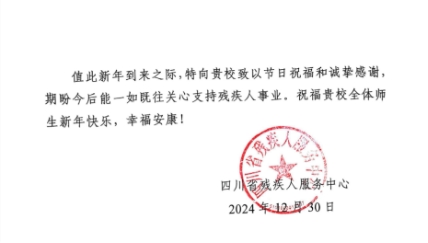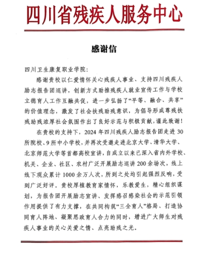 近日,bat365收到了一封来自四川省残疾人服务中心的感谢信,信中服务中心对bat365在“残疾人励志故事报告团”校园巡讲活动中的协助工作予以了高度的赞扬。