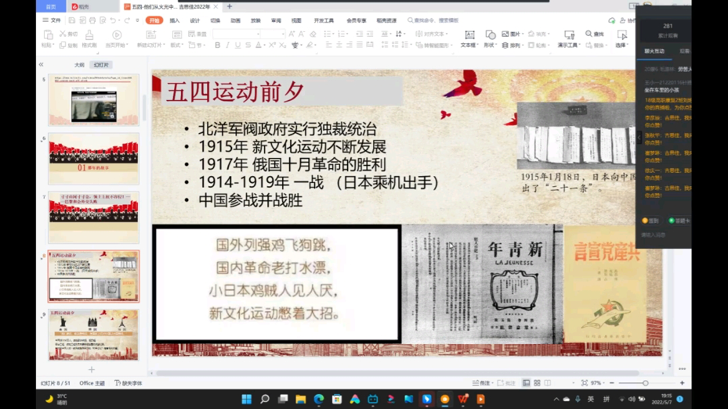 在百年前,愤怒于国仇家恨、彷徨于山河破碎、苦闷于前路迷茫的青年们,在得知北洋政府准备接受《凡尔赛条约》的消息后,终于爆发他们高呼着“外争国权,内惩国贼!”一场彻底反帝反封建伟大爱国革命运动就此展开。在吉思佳老师的讲解下那一声声撕心裂肺的呐喊仿佛在耳边响起,在民族存亡的危难时刻中国青年们用自己年轻的肩膀扛起这个国家的脊梁。“以青春之我,创建青春之家庭,青春之国家,青春之民族,青春之人类,青春之地球,……”中国共产主义的先驱李大钊先生曾如此深情寄语。今天的处于繁华盛世的我们,又有什么资格不奋斗、不努力呢?