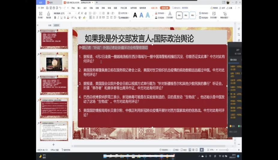 为纪念五四运动,党建促进会于2022年5月7日在钉钉开展了“谱青春华章,展时代风采”的线上精品党课,共有305人参加了此次线上党课。此次活动有幸邀请到康复学院辅导员吉思佳为主讲人。 吉老师向我们详细讲述了五四运动的背景,过程和意义以及在新形势下中国在政治军事等领域所面临的挑战与困难,鼓励青年学生努力奋斗,为祖国伟大复兴贡献自己的力量。