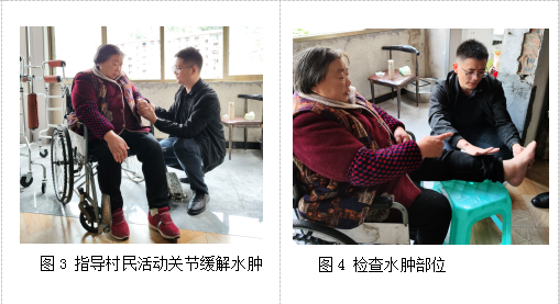 在另一名村民的家中,牟杨则针对其因脑出血导致的偏瘫和肌张力过大的问题,给予了其缓解肌张力、促进运动功能恢复等的指导。