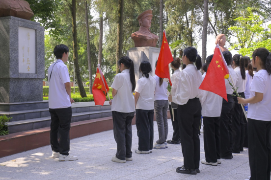 在烈士纪念碑前,党员教师和同学们整齐列队轻唱国歌,默哀三分钟、三鞠躬。以向革命烈士纪念碑献花、为烈士墓碑清除杂尘等方式,寄托对英烈的无尽哀思,深切缅怀革命先烈的丰功伟绩。