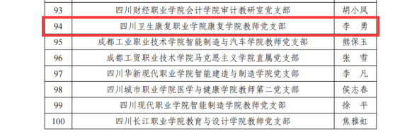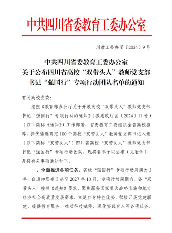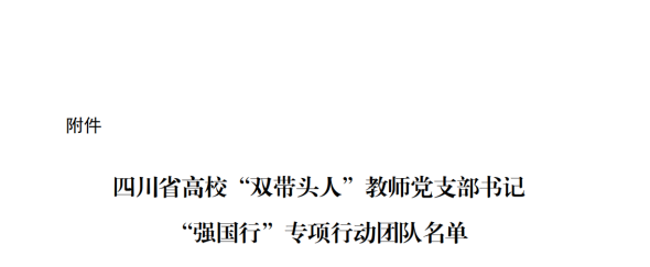 10月23日,中共四川省委教育工委办公室公布了四川省高校“双带头人”教师党支部书记“强国行”专项行动团队名单,bat365康复学院教师党支部成功入选四川省高校“双带头人”教师党支部书记“强国行”专项行动团队名单。