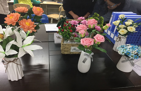 之后,于12月3日19:10二号教学楼b区307上交作品并做好登记,工作人员对其经行摆放和编号,第二天由系部老师共同评选。经老师商议得出一个一等奖,两个二等奖和三个三等奖。分别是一等奖纸艺雏菊,二等奖丝网加棉玉兰和丝网牡丹太阳花,三等奖丝网跳舞兰、纸艺桔梗花、纸艺牡丹,及优秀奖。
