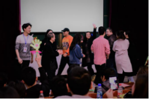 节目表演期间,主持人穿插了师生互动、全场抽奖环节,师生互动时,主持人在观众们地推选下,邀请宋自阆主任和刘孝祯老师以及现场同学一起参与我们的五毛一块活动,将联谊活动推到高潮。在全场抽奖环节中,由刘孝祯老师,余鑫老师,王栋梁在全场抽出三名获得三等奖的同学,由宋自阆主任在全场抽两名获得二等奖的同学,由殷铭刚主任在全场抽出获得最终的一等奖获得者,现场观众的互动,将现场气氛再一次达到高潮。