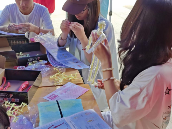 在“拼骨焕心・生命解构与重建”环节,同学们挑战人体骨骼与内脏拼装。随着裁判一声令下,散落的内脏零件在指尖迅速“归位”,气管、心脏、肺部的精准拼接间,大家沉浸式感受人体结构的精密与奇妙。“原来胆囊的位置这么特别!”“肝脏的位置比想象中更靠下!”现场讨论声此起彼伏。这场充满“解剖学趣味”的挑战赛,不仅让同学们重温课堂知识,更在专注拼装中释放学业压力。