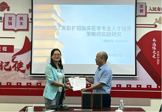 4月30日,临床医技学院2021年省级课题《高职扩招临床医学专业人才培养策略的实践研究》开题报告会在2-B315B成功举行。自贡市教育科学研究所罗国咸教研员、陈丽霞教研员、刘小文教授、刘贻超高级讲师、曹灵红主任医师出席会议,并担任论证专家。学校副校长罗天蔚,科研处处长伍勇,临床医技学院院长蒲建萍等课题组成员参会。