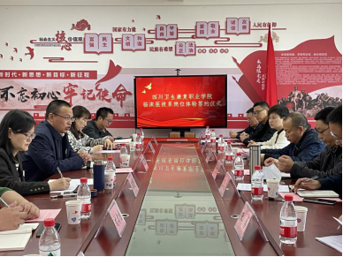 4月14日上午,临床医技系与八所基层医疗单位举行岗位体验签约仪式。沿滩区人民医院副院长李伯亭、卫坪中心卫生院院长万秋泉、自贡市沿滩区沿滩镇卫生院副院长李朝然、沿滩瓦市中心卫生院副院长赖友清、何市中心卫生院副院长陈佳勇、新民镇卫生院副院长李丹、大山铺中心卫生院副院长陈智勇及医务科科长胡长碧、仙市卫生院副院长朱勇、学院副院长熊骥、教务处副处长刘凡诗、临床医技系主任蒲建萍、副主任杨新春、副主任刘孝桢参加签约仪式。