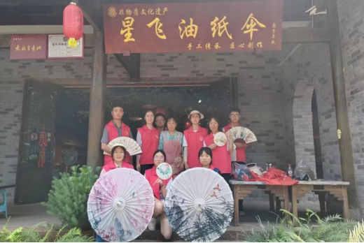 江阳非遗小队到达尧坝古镇时正是烈日当午,顶着火热的高温,同学们踏着坚定地脚步来到传承非遗文化的第二站,在了解完古镇的历史之后,见到了星飞油纸伞的代传承人,探寻这古老的技艺。一把伞需要一百多道工序,耗时三个月,才可以制作完成,工艺之复杂难以言说,纯手工制作,实属艰难,那么得以传承的诀窍是什么?小分队认为是“坚持”是“初心”,这正是需要我们去传承发扬的优秀中国优秀传统文化。
