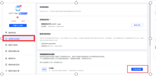 2、进入个人中心,选择关联机构IP自动关联
