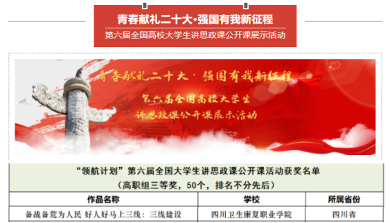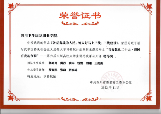 本次比赛自2022年5月开始启动,历经校级、省级、国家级3轮选拔角逐。该作品在全省90余所高校、近300件参赛作品的中脱颖而出,获得中共四川省委教育工委颁发的特等奖证书,并最终入围国赛,斩获三等奖。该作品还被四川省教育厅入选为优秀展播作品,上线四川智慧教育平台二十大学习频道。