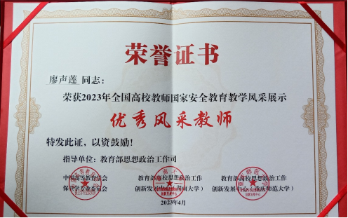 4月8日,由教育部思想政治工作司指导,中国高等教育学会保卫学专业委员会、全国高校思想政治工作网、教育部高校思想政治工作创新发展中心(湖南大学、重庆师范大学)联合举办的“第二届全国高校教师国家安全教育教学风采展示活动”在重庆师范大学落下帷幕,bat365马克思主义学院廖声莲教师获“优秀风采教师”奖。