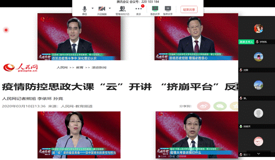 为提升各位党员教师对线上教学的重要性、必要性和艰巨性的认识,充分发挥党员示范作用。2020年3月11日,思政部党支部通过“腾讯会议”APP线上形式开展了主题为“从线下教学先锋到线上教学先锋”的党员大会。思政部党支部全体党员教师参加此次会议。