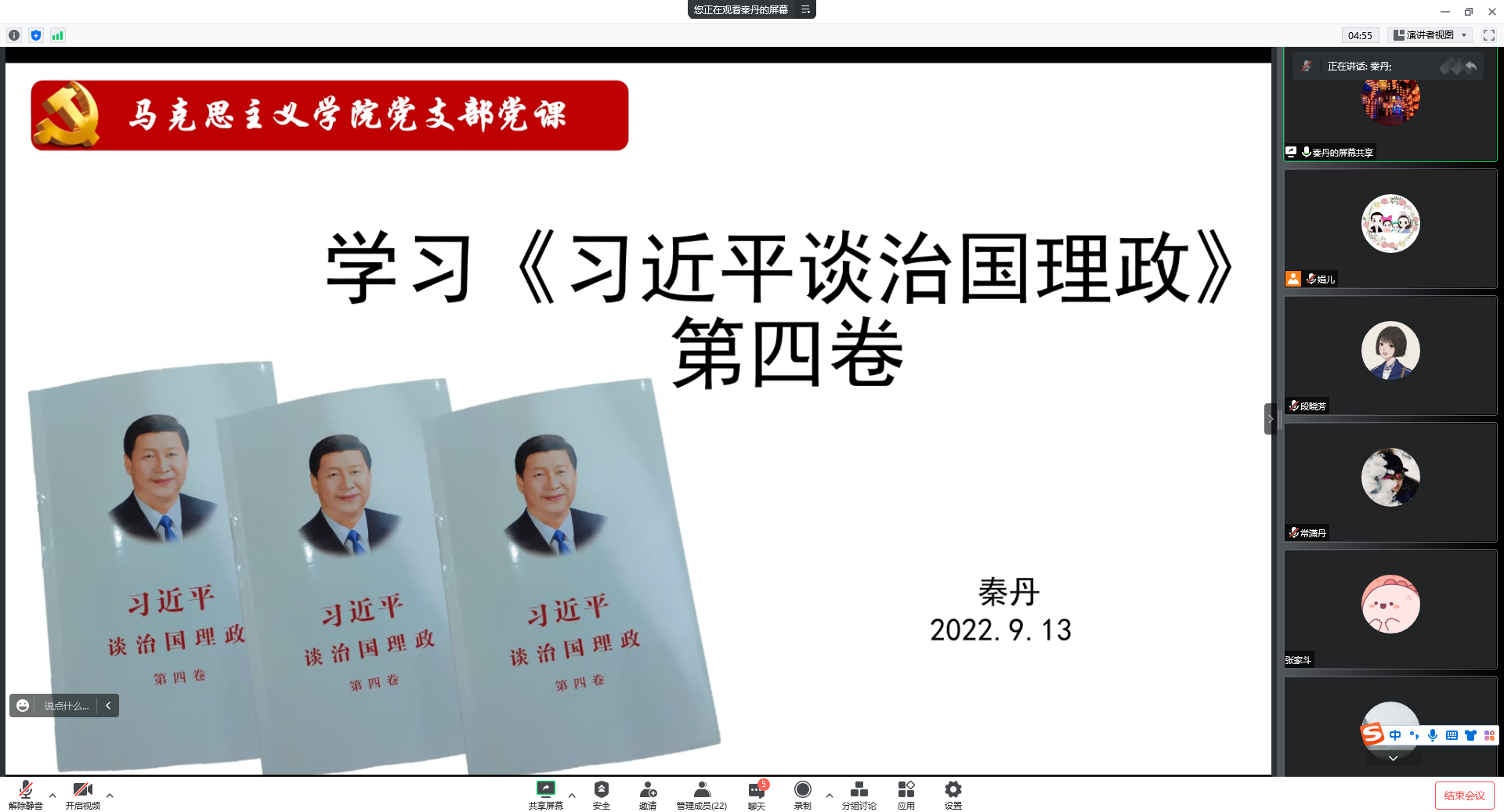 为进一步增强党员教师的思想自觉、政治自觉、行动自觉,引领党员教师读原著、学原文、悟原理、知原义。本学期伊始,马克思主义学院就将《习近平谈治国理政》第四卷列入理论学习计划,并组织党员教师利用每周二政治学习,每人领学一个专题,通过“线上+线下”方式分章节、分专题学习研讨。