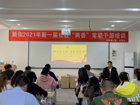 3月29日上午,思政部党支部副书记、副主任罗智凯在自流井区孵化园向新街街道社区“两委”常职干部讲授以“奋斗百年路,启航新征程——中国共产党百年奋斗历程与启示”为主题的党课。自贡市委组织部调研员张劲,自流井区新街党工委书记何嘉及社区“两委”常职党员干部共计40余人参加了学习。