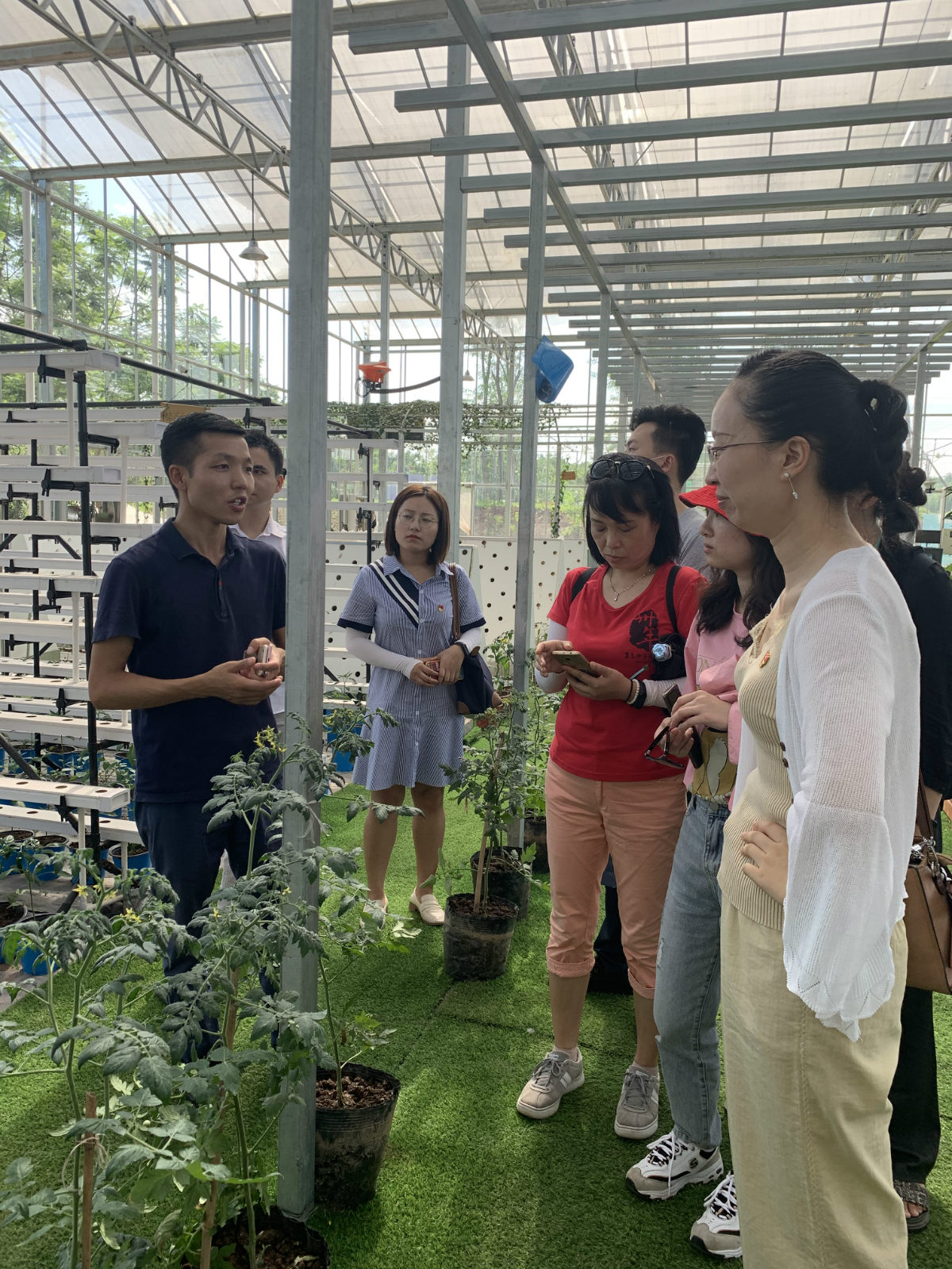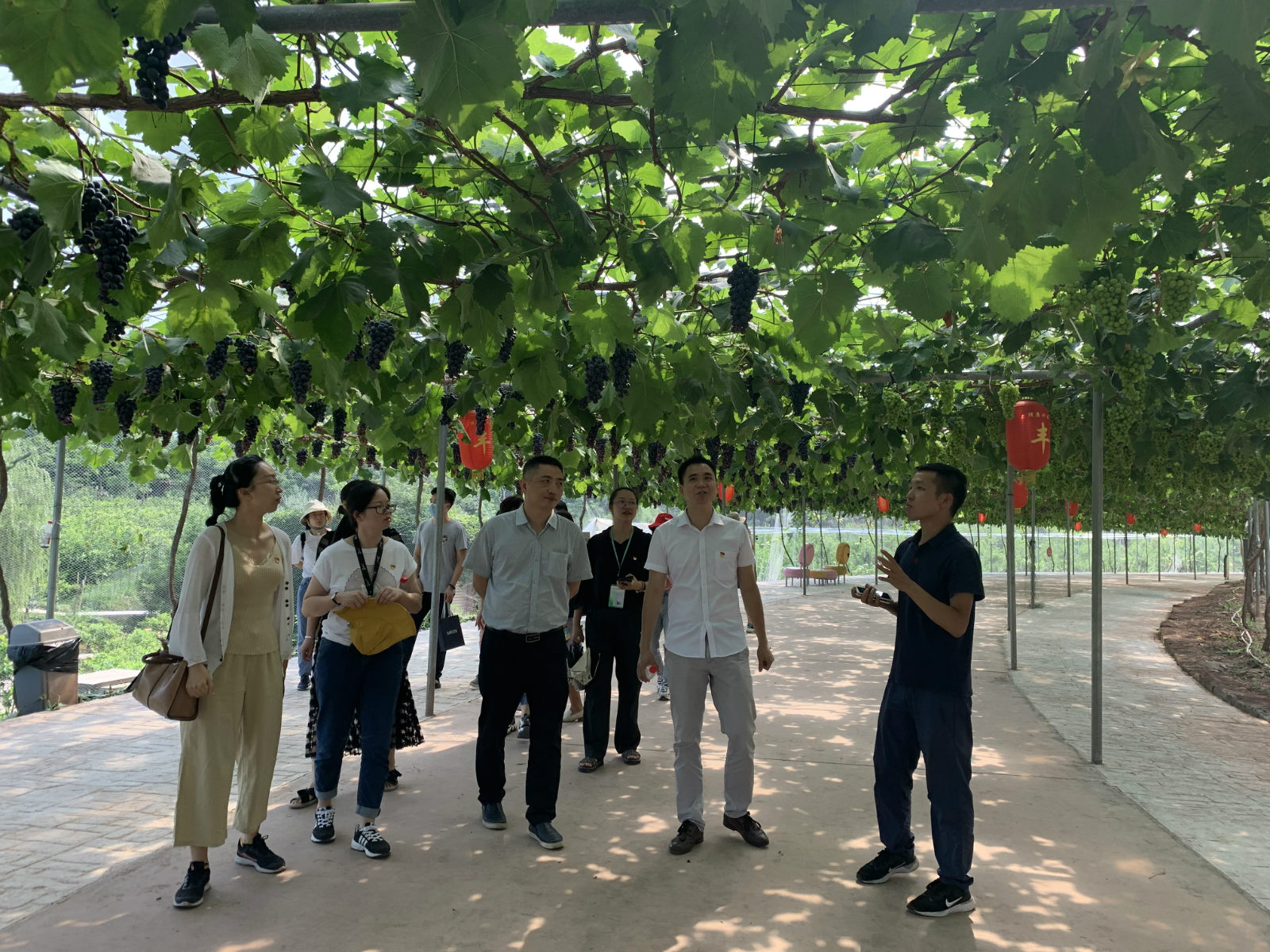 伴随着阵阵果香和映入眼帘丰硕果实,在荣边镇负责人员的带领下,我们参访了自贡市乡村振兴学院“实践基地——健康田园”。在百米葡萄长廊中感受到先进的滴灌技术使用,藤蔓下结出一串串色泽晶莹剔透的果实,让人连连称奇;在热带大棚培育园,看到无土栽培技术成熟运用,花卉竞相开放,硕果累累。在农业科普展览馆,看到怎么从培土、发芽、生长、开花和结果,可以体验参与,让人跃跃欲试!据了解该项目集农业、休闲、采摘、科普于一体,集中农民流转土地,加上政府的大力支持,引进知名农产品公司进行开发,有效带动周边农民居家就业,是自贡市乡村振兴示范产业振兴基地。