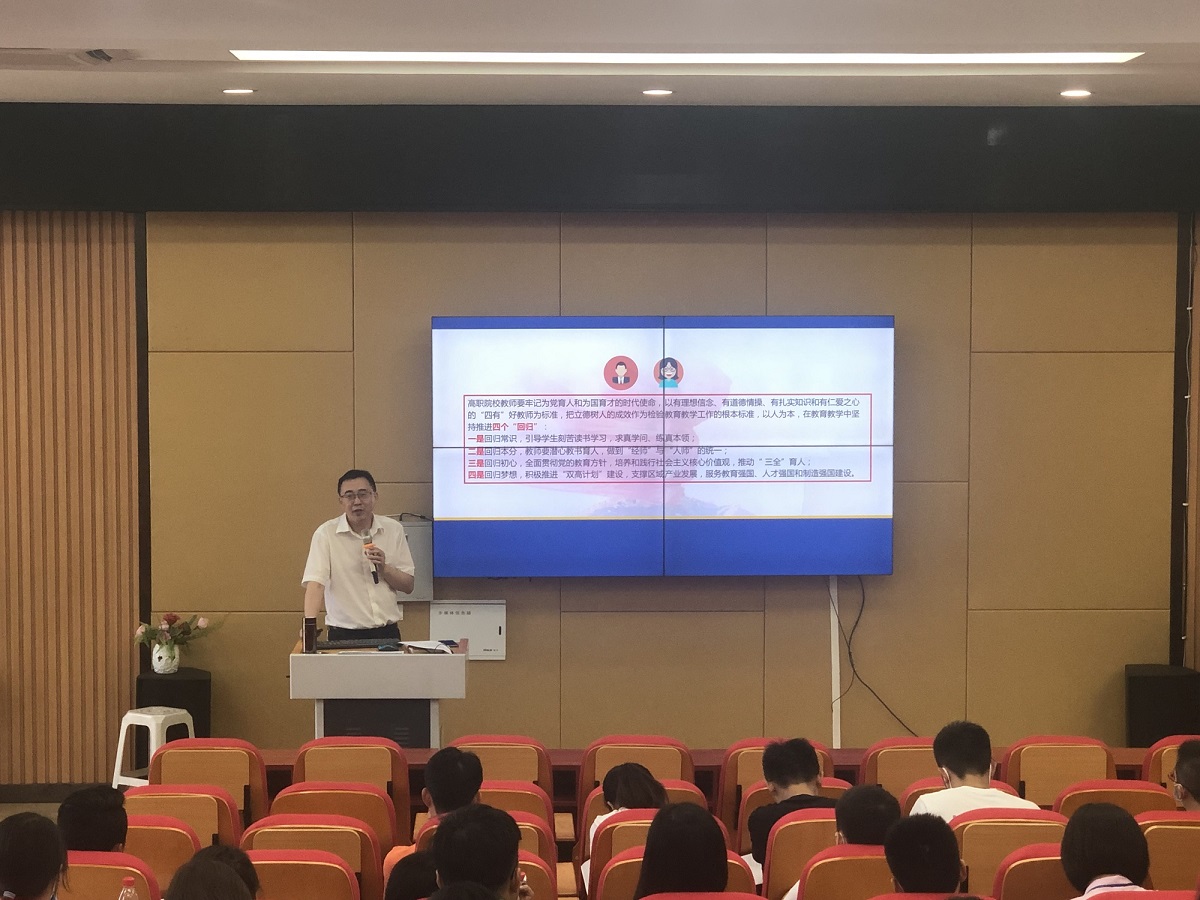 申奎首先介绍了《国家职业教育改革实施方案》和《关于实施中国特色高水平高职学校和专业建设计划的意见》的政策背景。随后分别从高职院校教师专业发展的价值取向、逻辑基点、能力要素分析和推进策略四个方面阐述了青年教师提升专业发展的具体路径。然后重点强调青年教师一定要牢记为党育人和为国育才的时代使命,以有理想信念、有道德情操、有扎实知识和有仁爱之心的“四有”好教师为标准,把立德树人的成效作为检验教育教学工作的根本标准。最后申奎阐述青年教师一定要具备扎实的专业知识与熟练的岗位操作技能、分析问题与解决的能力、跨学科能力和对智能网络高度的理解与运用能力。