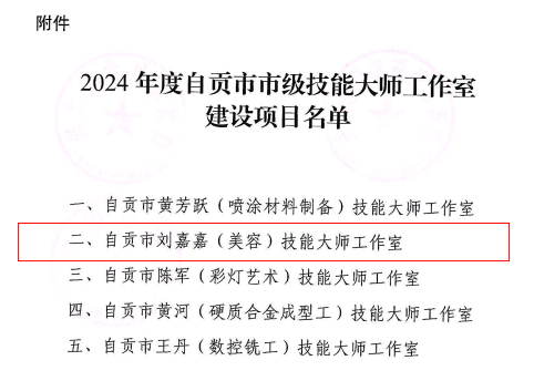 近日,中共自贡市委组织部等五部门公布了2024年度自贡市市级技能大师工作室建设项目名单,学校刘嘉嘉(美容)技能大师工作室成功立项。
