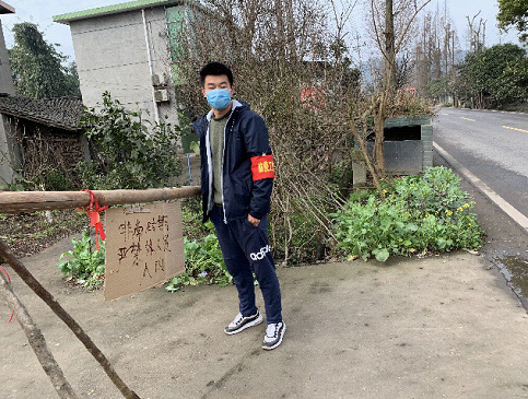 19级休闲体育1班陈伟懿,在四川省眉山市青神县罗波乡龙泉村做防疫志愿者,主要负责外来人员排查和登记。他的爸爸妈妈和奶奶都是党员,这个春节全家人都参与到了防疫工作中。他呼吁:“请社区人民主动配合防疫工作,不出门,不串门,不聚众,大家共同努力打赢这场防疫战!”