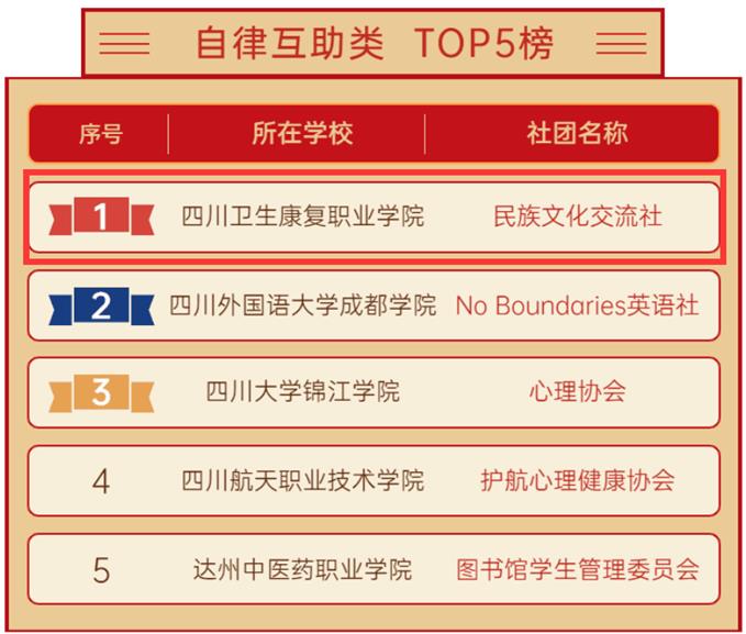 团省委参考团支部建设成果和日常工作了解,最终确定《2022年度四川省高校“活力团支部”TOP榜》和《2022年度四川省高校“活力社团”TOP榜》。其中,bat365的民族文化交流社成功入选《2022年度四川省高校“活力社团”TOP榜》自律互助类TOP5榜榜首!