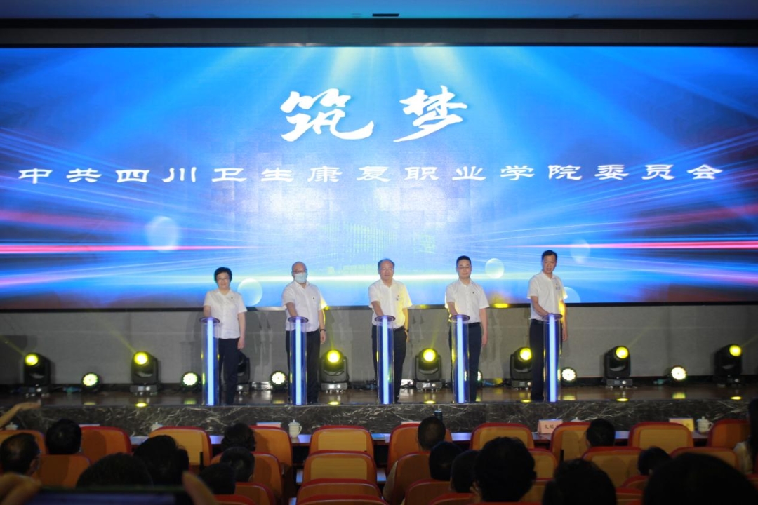 市委组织部部务委员宋代平,市卫健委机关党委书记文铭生和学校领导刘建辉、黄昌平、姜晓燕共同点亮“筑梦”项目启动灯。