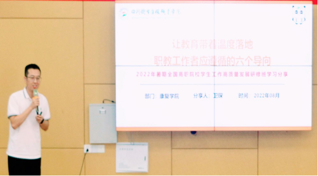 仪式上,新入职辅导员进行了庄严宣誓。新入职辅导员代表刘御珂结合岗前培训,表达了牢记誓言,当好学生健康成长知心朋友和人生导师的决心。康复学院学生科科长卫琛以《让教育带着温度落地》为题,结合暑期参加全国高职院校学生工作高质量发展研修班的情况,分享了工作经验和心得体会。